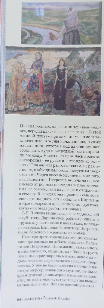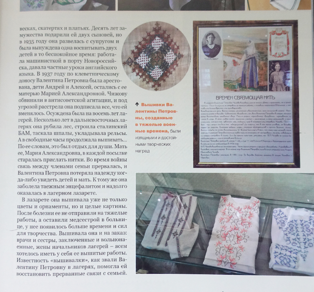 Экспозиция выставки посвящена Валентине Петровне Чижовой, талантливой вышивальщице, осуждённой на лагеря в 40е гг ХХ века.