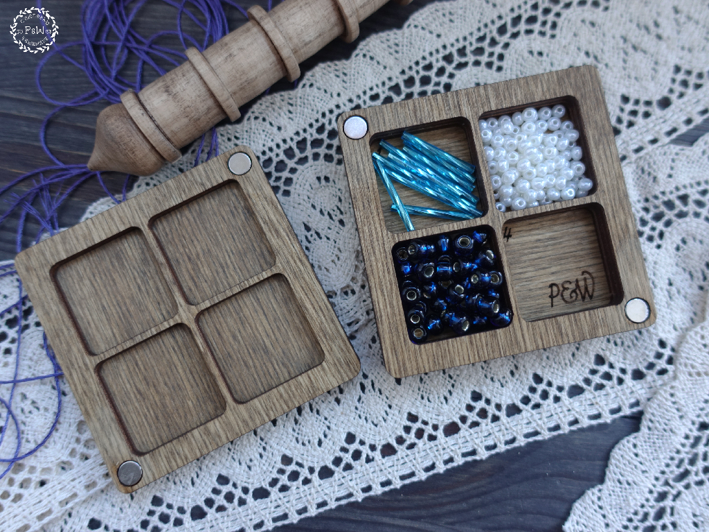 Бисерница состоит из двух этажей. Основной, находящийся посередине, вмещает в себя 4 ячейки, каждая с нумерацией, размер ячейки 3х3х0,8 см.