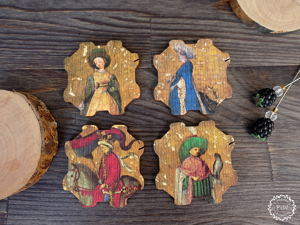 При этом старшие карты имеют интересные особенности. Две масти имеют только женские фигуры, а две масти только мужские. Мужские фигуры: валет, офицер, король - масти птиц: утки и соколы. Женские фигуры: дева, дама, королева – масти животных: собаки и олени. Такая система старших/придворных карт напоминает упрощённый вариант колоды тарокки Висконти-Сфорца Кэри-Йель и нигде больше не встречается. Позднее в европейских колодах осталась только дама (в английской - королева) из всех этих женских персонажей. К сожалению, до нас дошло только 49 карт из всей колоды.