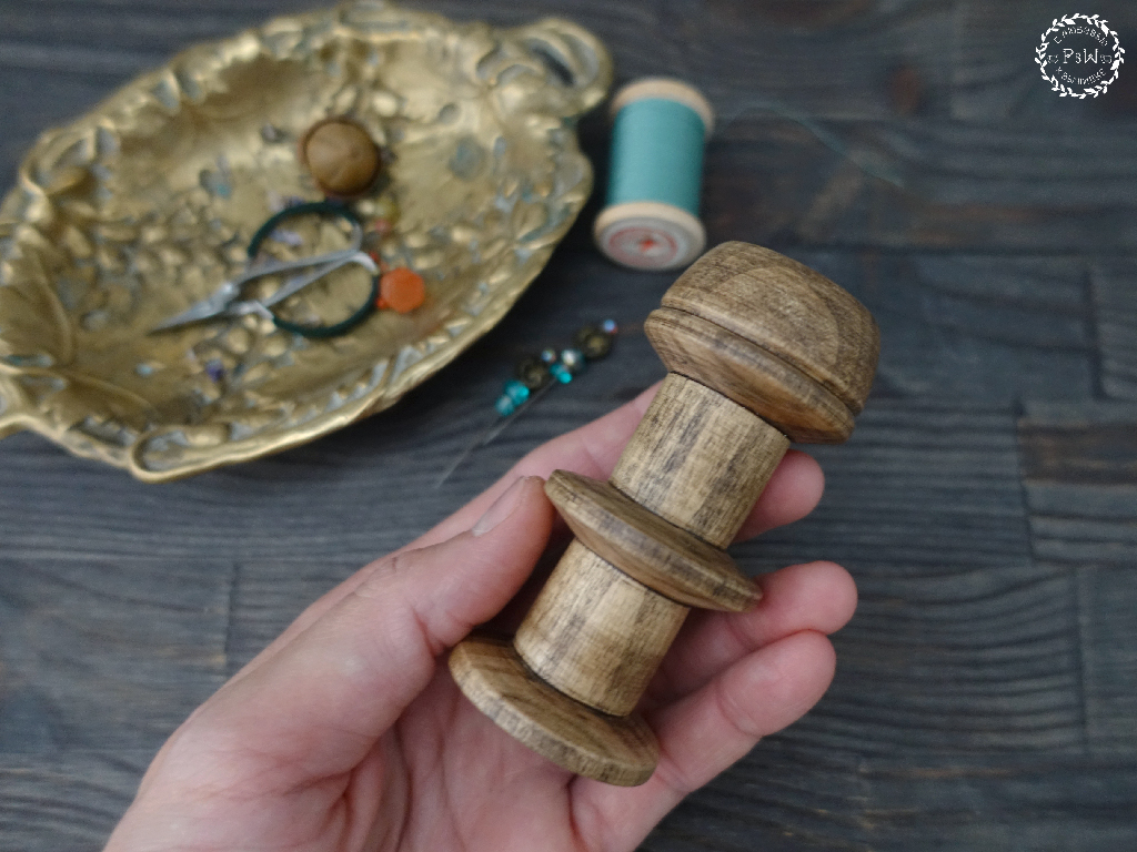 На корпусе две секции для намотки ниток\кружева, ширина одной секции 2,5 см, глубина 1 см. Устойчивое основание, стоит.