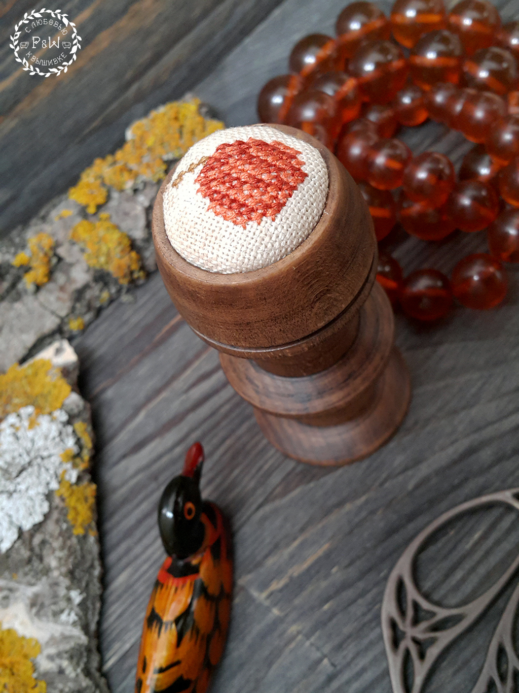 Крышка выточена с углублением для оформления подушечки-игольницы, размеры под игольницу - d 3 см, глубина 1 см.