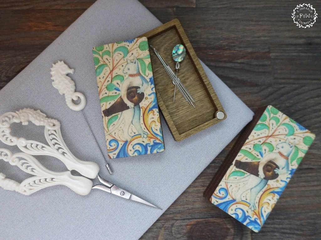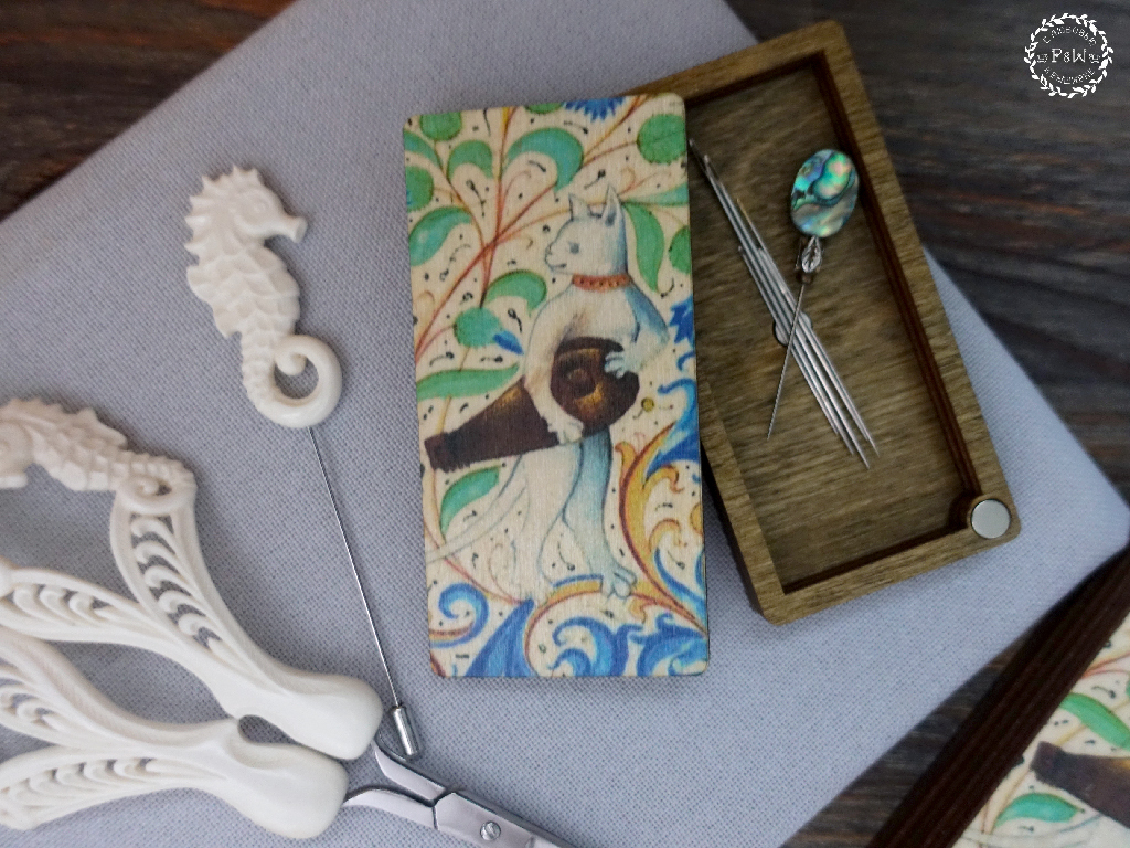 Нежный беленький котик из французского часослова 1485 – 1490 гг стал принтом для крышки этой вместительной игольнички. Котик держит в лапках средневековый музыкальный инструмент колесную лиру (органистр, реля, никельхарпа) — струнный музыкальный инструмент, где роль смычка выполняет вращающееся колесо.