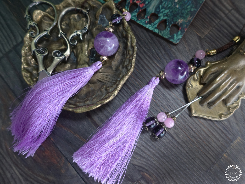 Фурнитура с золотистыми элементами подчеркивает красоту аметиста. В маячке также использованы бусины розового кварца (d 8 мм) и аметиста потемнее (d 9 мм) + кисть из винтажного искусственного шелка, плетёная вручную. Кисть я оставила максимально длинной 10 см, вы можете подрезать ее на нужную вам длину. Кисть можно отпаривать на режиме "шёлк" (минимальный нагрев утюга).