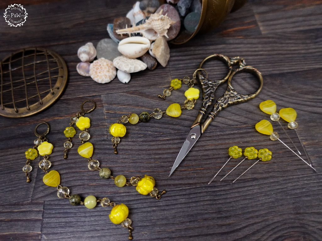 Комплект состоит из двух штук - одна игла с бусиной-сердечком собрана на основе острой бисерной иглы Regal №9 (длина иглы 4,5 см), вторая "ушком вниз" - с бусиной-цветком собрана на основе гобеленовой иглы №28 (длина иглы 3,5 см).