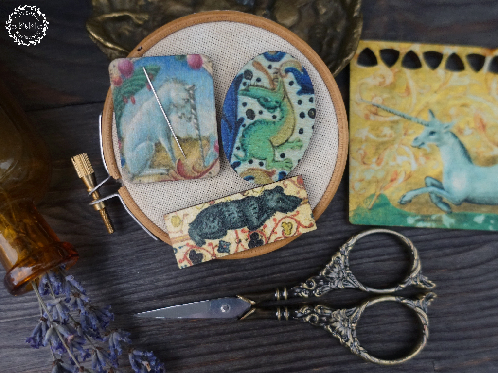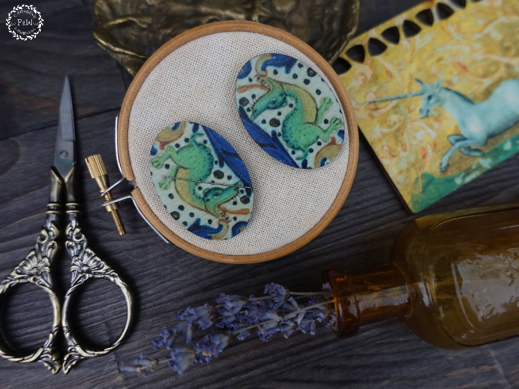 Деревянный кабошон с принтом из средневекового манускрипта.