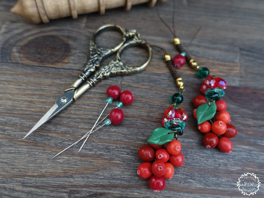 Яркая изумрудная зелень разнофактурного чешского стекла Preciosa Ornella дополнена листиком и ягодками клюквы, вылепленными вручную мастером полимерной миниатюры.
