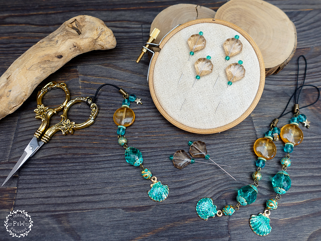 Подвеска с эмалью в виде ракушки в тон общей колористике маячка, а круглая бусинка апельсинового цвета, как солнце в зените.