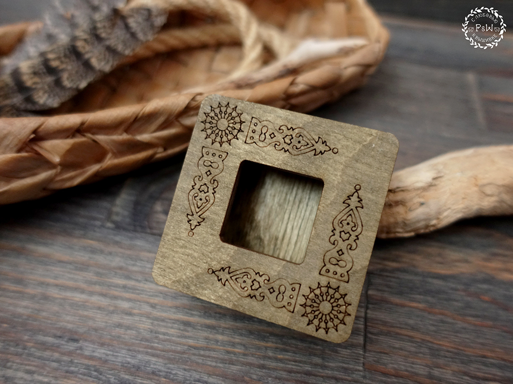 Орнаментика гравировки - домовая резьба с изб 19 века. Холодный затемнённый цвет тонировки дерева дополнительно создает эффект старины.