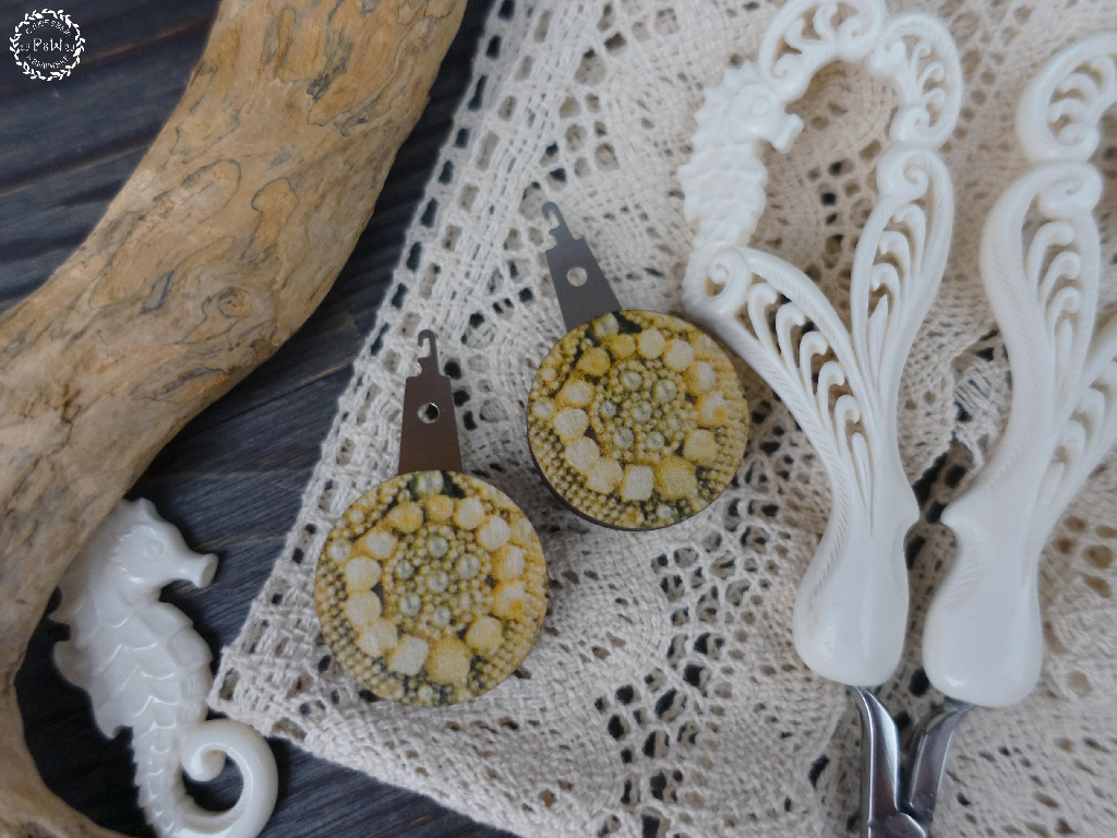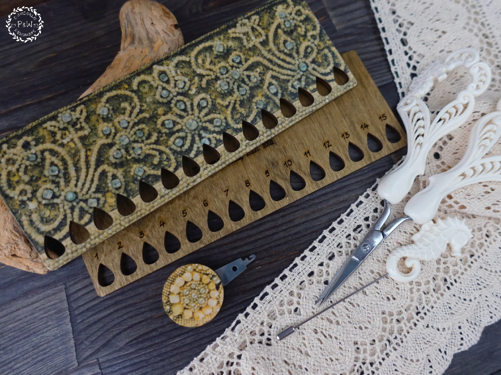 Нитковдеватель с принтом детали Каргопольского кокошника Олонецкой губернии, датируемого второй половиной XIX века. Кокошник из коллекции Натальи Леонидовны Шабельской, хранится в The Metropolitan Museum of Art.