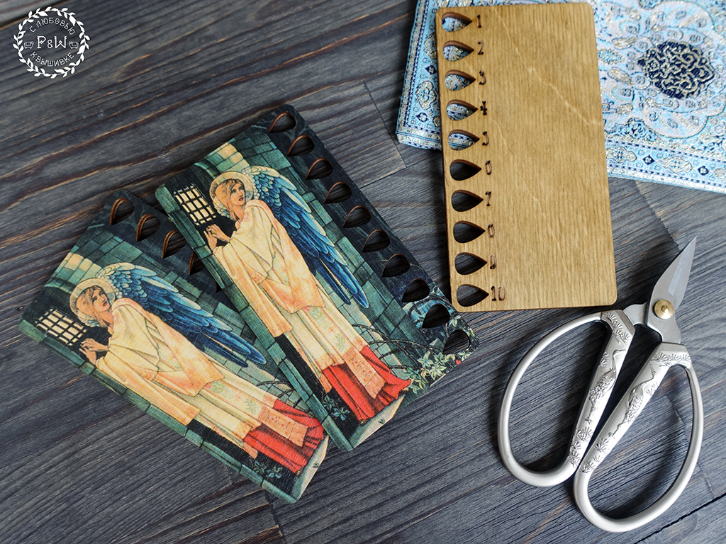 Принт закреплен лаком и дополнительно отшлифован вручную до гладкости, не сотрётся и не выцветет. Материал фанера толщиной 4 мм. Размер изделия 63 х 120 мм, удобные каплевидные прорези для закрепления мулине размером 8х11 мм. Рассчитан на 10 цветов, гравировка нумерации на обороте.