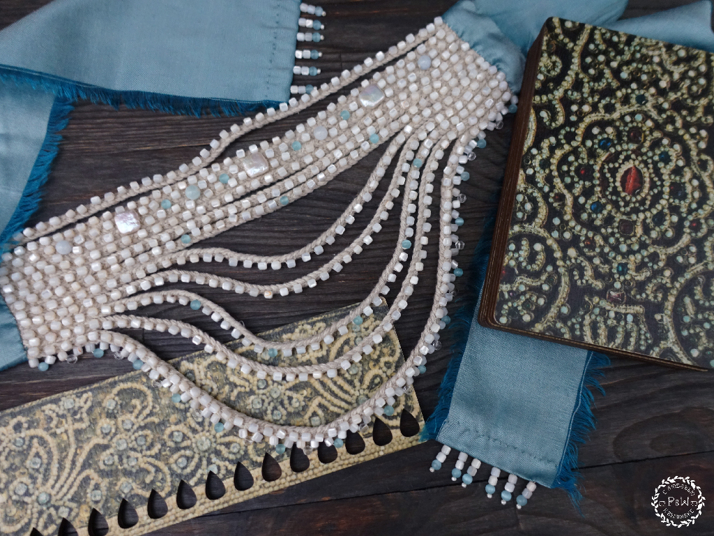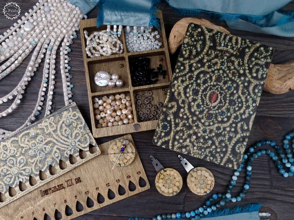 В коллекции "Жемчужное шитье" выпущены также магнит для игл, нитковдеватель и шкатулка-бисерница.