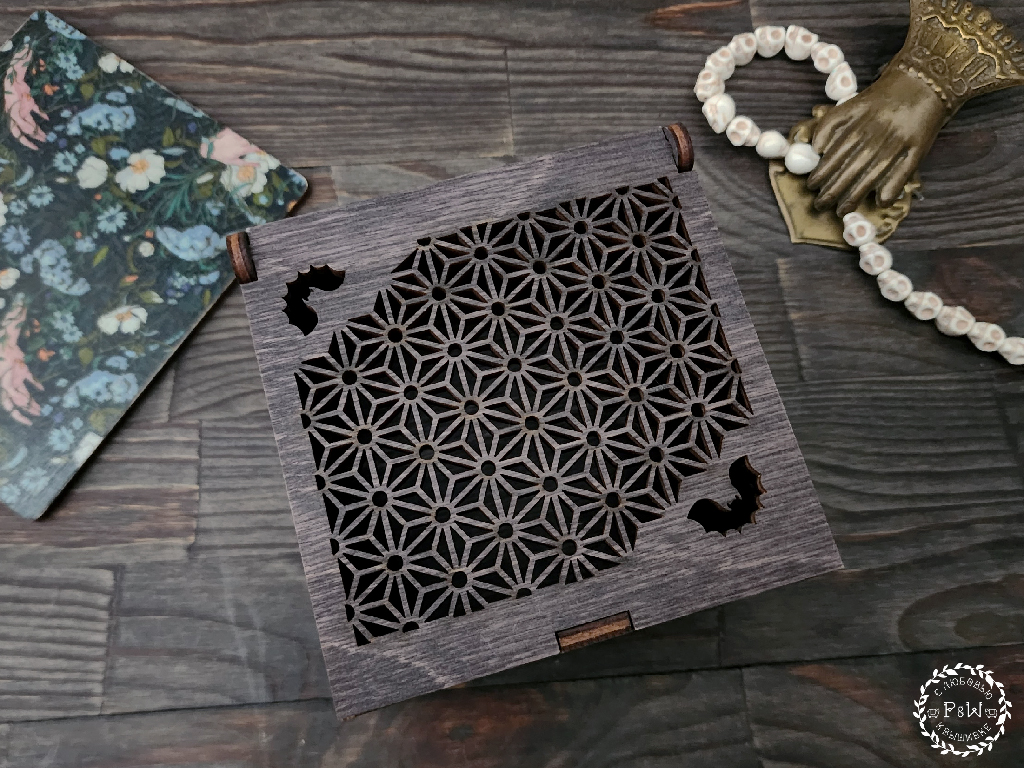 Нежная, ажурная, стильная шкатулка в серо-черном оттенке с двумя летучими мышками на крышке.